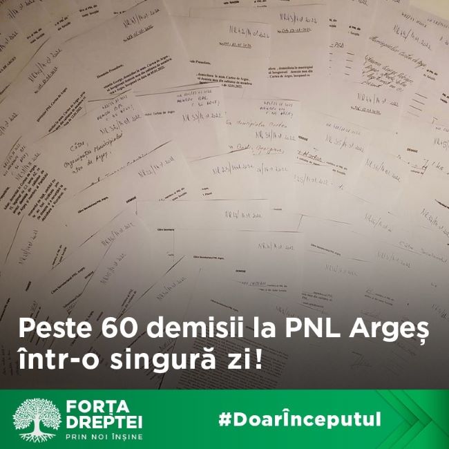 Peste 60 de liberali au ales vineri să își dea demisia din PNL Argeș, după ce noua conducere a partidului a demonstrat că nu dorește să respecte voturile românilor și susține concubinajului politic împotriva firii dintre PNL și PSD. De asemenea, noua conducere interimară a PNL Argeș a fost instalată nestatutar și a ales să dizolve fostul Birou Politic Județean, ales democratic la conferința județeană de alegeri din iulie anul trecut. De aceea suntem convinși că vor urma și alte demisii, în perioada următoare.