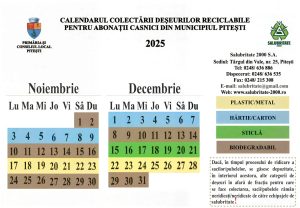 Salubritate 2000 S.A. readuce în atenția abonaților casnici din Pitești graficul de colectare a deșeurilor reciclabile, pe fracții separate, conform calendarului de mai jos.