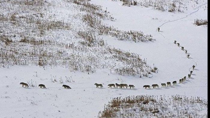 În imaginea postată pe contul de Facebook al Parcului Natural Vanatori Neamt este o haită de lupi, iar în descriere ni se explică de ce merg animalele în ordinea în care le vedem în poză.