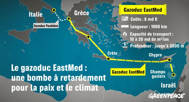 GreenPeace, în fața dublului pericol pe care îl reprezintă acest proiect de construire a gazoductului EastMed, atât pentru pace, cât și pentru climă, cere Comisiei și guvernelor europene să-l retragă de pe lista PIC (proiectelor de interes comun) și să efectueze o evaluare a riscurilor de conflict pentru orice infrastructura transfrontalieră a combustibililor fosili susținută de UE. Franța trebuie să-și asume la rândul ei responsabilitatea de a convinge UE să retragă susținerea acestui proiect.