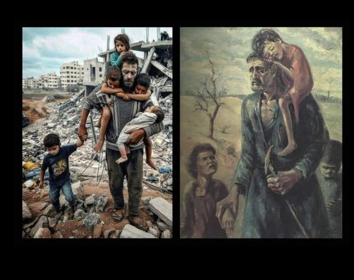 1) Stânga: Palestinian îndepărtându-și copiii de ruinele locuinței distruse, octombrie 2023.
