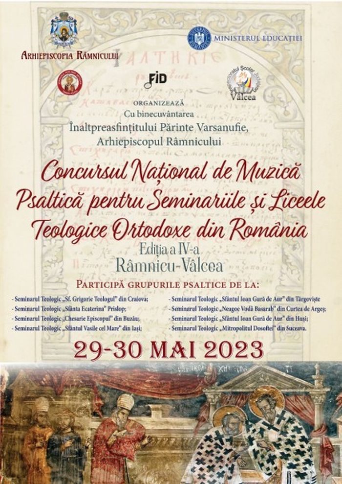 Cu binecuvântarea Înaltpreasfințitului Părinte Varsanufie, Arhiepiscopul Râmnicului, în perioada 29-30 mai, Arhiepiscopia Râmnicului, organizează Concursul Național de Muzică psaltică pentru Seminariile și Liceele Teologice Ortodoxe din România, ediția a IV-a.
