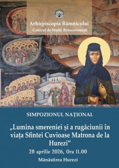 Arhiepiscopia Râmnicului, prin Centrul de Studii Brâncovenești, cu binecuvântarea Înaltpreasfințitului Părinte Arhiepiscop Varsanufie, organizează Simpozionul Național „Lumina smereniei și a rugăciunii în viața Sfintei Cuvioase Matrona de la Hurezi”, eveniment care va avea loc la Mănăstirea Hurezi, marți, 28 aprilie 2026, începând cu ora 11.00.