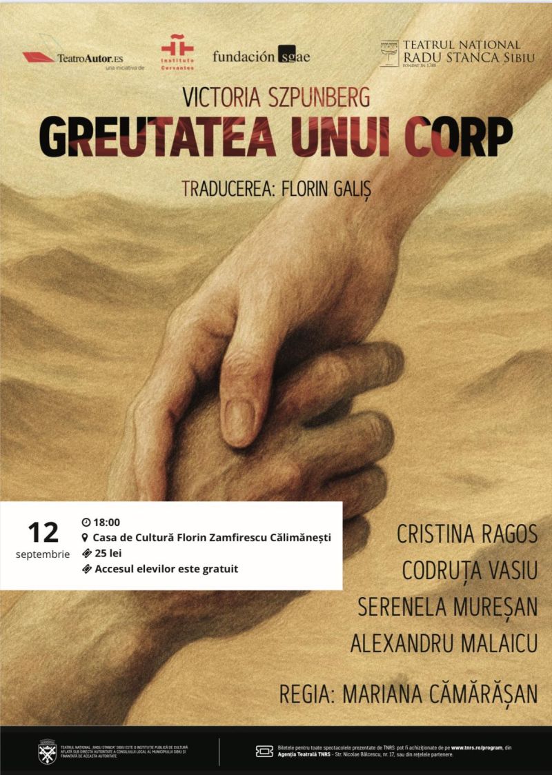 Casa de Cultură „Florin Zamfirescu” găzduiește vineri, 12 septembrie, orele 18:00, piesa de teatru „Greutatea unui corp” de Victoria Szpunberg, în regia Marianei Cămărășan, o producție a Teatrului Național „Radu Stanca” Sibiu.
