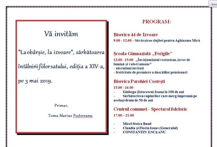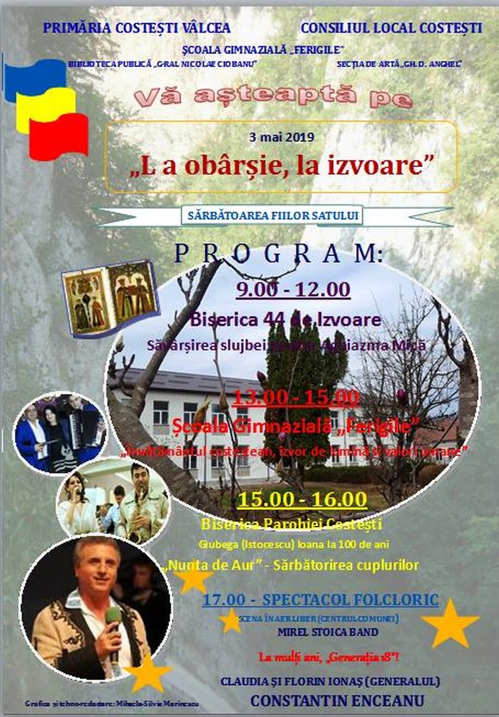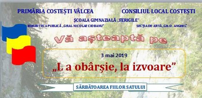 Primarul Toma Peșteranu din Costești (Vâlcea) vă invită în data de 3 mai 2019 la „La obârșie, la izvoare”, sărbătoarea întâlnirii fiilor satului, ediția a XIV-a.