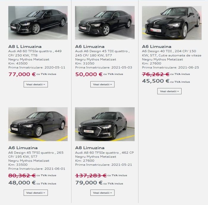Stimați vizitatori, mulțumim pentru vizita pe site-ul Audi Approved Plus! Ne rezervăm dreptul de a implementa modificări pe website fără o informare prealabilă. Deși lucrăm în fiecare zi la menținerea corectitudinii informațiilor afișate, totuși, acest website ar putea conține erori și omisiuni pentru care nu ne putem asuma răspunderea. Imaginile folosite sunt destinate exemplificării și ca atare sunt doar cu titlul de prezentare. Prețul afișat este stabilit, de o manieră independentă, de către dealerul care comercializează autoturismul în cauză, în conformitate cu propria politică comercială.