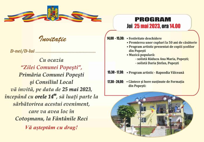 Primăria și Consiliul Local Popești organizează joi, 25 mai 2023, ”Ziua Comunei Popești”. Evenimentul va începe la orele 14.00 și va avea loc în Cotoșmanu, la Fântinile Reci.
