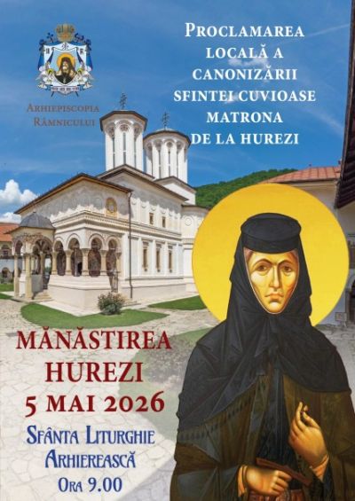 Proclamarea locală a canonizării Sfintei Cuvioase Matrona de la Hurezi va avea loc la Mănăstirea Hurezi, în cadrul unor evenimente liturgice ce sunt programate în perioada 4-5 mai 2026.