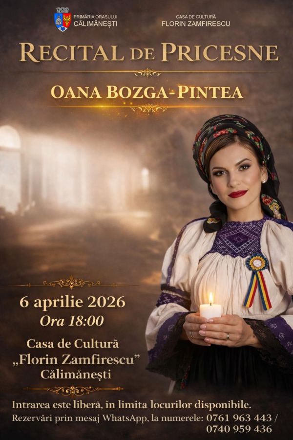 În Lunea Mare din Săptămâna Sfântă a Patimilor, când gândul și sufletul întregii creștinătăți se îndreaptă cu mai multă luare-aminte spre jertfa și Învierea Mântuitorului, vă invităm să luați parte la un recital de pricesne susținut de artista Oana Bozga-Pintea, începând cu ora 18:00, la Casa de Cultură „Florin Zamfirescu” din Călimănești.